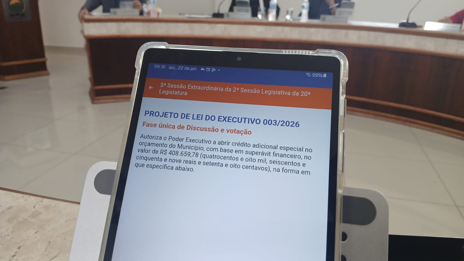 Autoriza a abertura de crédito adicional especial no valor de R$ 408.659,78, fruto de emendas do deputado estadual Rodrigo Lopes, destinadas à aquisição de viaturas para a Polícia Civil.