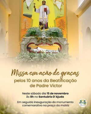 O Santuário Diocesano de Nossa Senhora D’Ajuda, em Três Pontas, promoverá neste sábado, 15 de novembro, uma programação especial em comemoração aos 10 anos da Beatificação de Padre Victor. A celebração terá início às 8h, com uma missa em ação de graças no Santuário, reunindo fiéis, autoridades religiosas e devotos do beato.